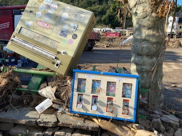 Doch keine Geschichte bleibt ohne Wendepunkte. 2020 kam die Pandemie und die Automaten blieben unberührt. Ein Jahr später folgte die Flut im Ahrtal und fast alle meine Automaten wurden zerstört. Es fühlte sich an, als würde alles, was ich aufgebaut hatte, einfach fortgespült. Aufgeben war trotzdem keine Option. Denn immer wieder sah ich dieses Bild: ein Kind vor einem Automaten, voller Vorfreude. Viele sagten mir, ich solle weitermachen. Diese Kästen bringen noch heute Menschen unterschiedlichster Generationen zusammen und schaffen kleine Momente, die man nicht digital ersetzen kann. Also restauriere ich weiter, auch wenn Münzgeld immer seltener wird. Freunde sammeln für mich Kleingeld, Banken hingegen machen mit ihren Gebühren wenig Mut. Wie die Zukunft ohne Bargeld aussieht, weiß ich noch nicht. Aber darum kümmere ich mich, wenn es soweit ist.